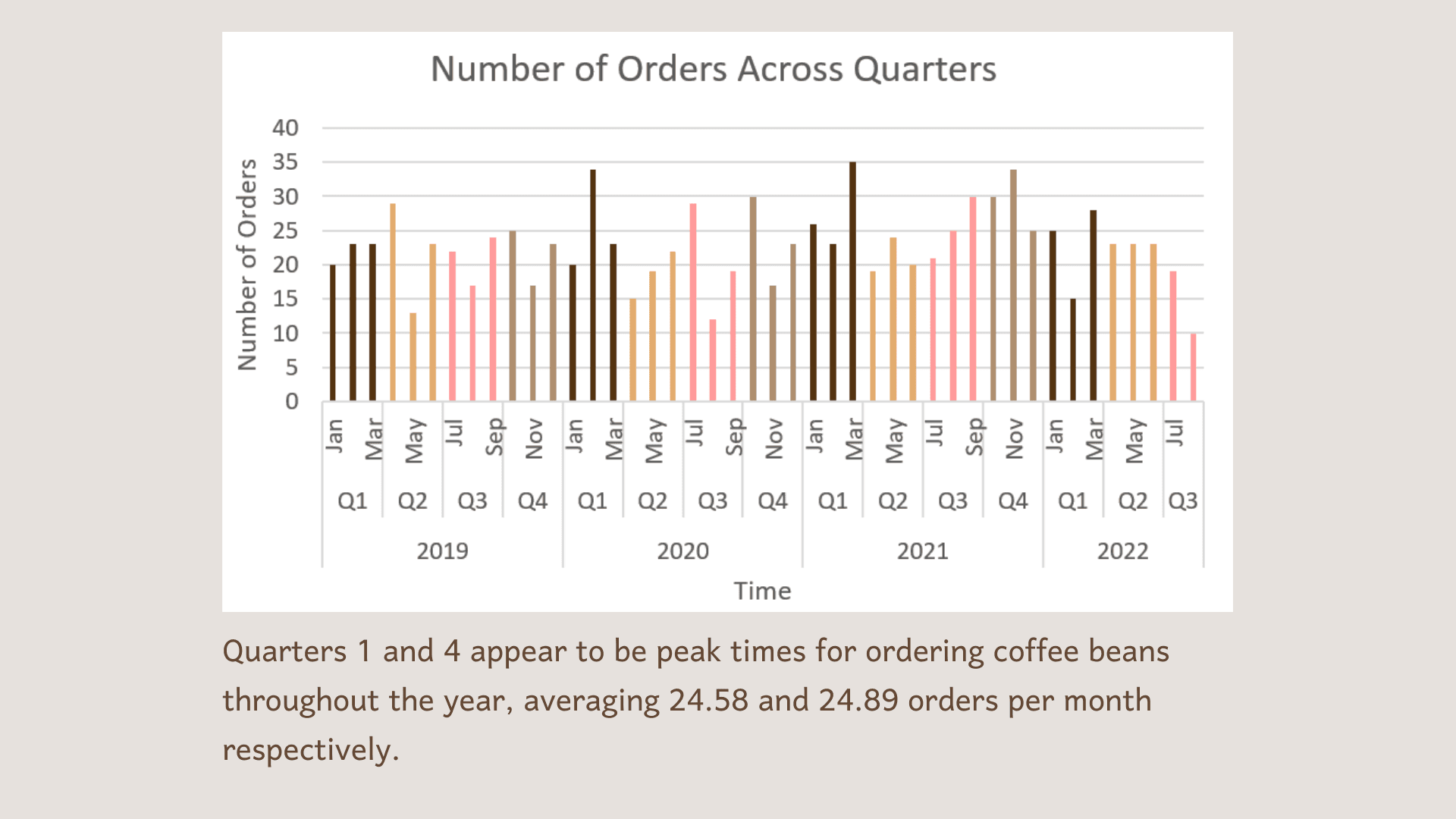 Quarters 1 and 4 appear to be peak times for ordering coffee beans throughout the year, averaging 24.58 and 24.89 orders per month respectively.