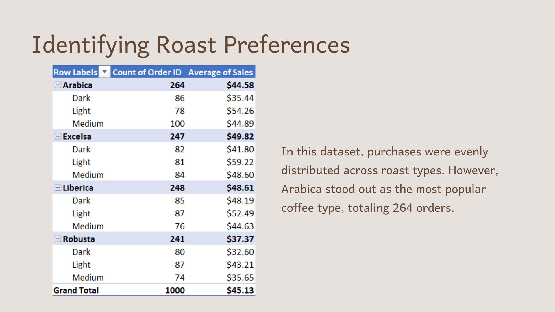 In this dataset, purchases were evenly distributed across roast types. However, Arabica stood out as the most popular coffee type, totaling 264 orders.