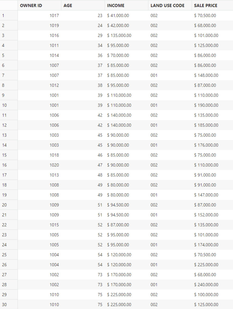 The findings of Query 1 present a comprehensive view of owner demographics (owner id and age), income distributions (income), and property characteristics (land use code and sale price). A land use code of “001” is representative of a luxury single-family residence, whereas a code of “002” is representative of an affordable single-family residence. Organized in ascending order by age and income, this highlights the significance of these factors in real estate purchase decisions.