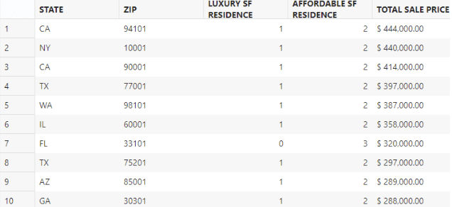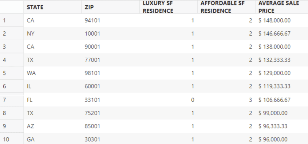 These insights shed light on the impact of zip codes on property values, offering valuable guidance to stakeholders involved in strategic decision-making. For instance, the zip code 94101 in California emerges as the most expensive with an average sale price of $148,000. Following closely is 10001 in New York, with an average of 146,666.67, 90001 in California at $138,000, and so forth. This trend persists in the total sale prices, reinforcing the notion of higher living expenses in California (zip codes 94101 and 90001) and New York (10001) compared to other states collected.