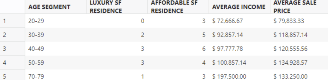 Query 2: Segment by age and display averages for income, sale price, rooms, and square feet