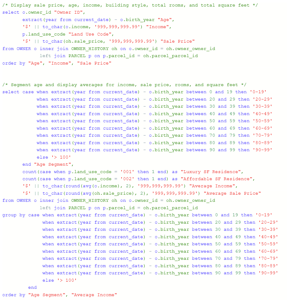 Query 2 further refines the data, arranging results in ascending order based on age segments. This segmentation in 10-year increments allows for a clearer understanding of trends across different age groups regarding counts of luxury and affordable residences, average incomes, and average sale prices.