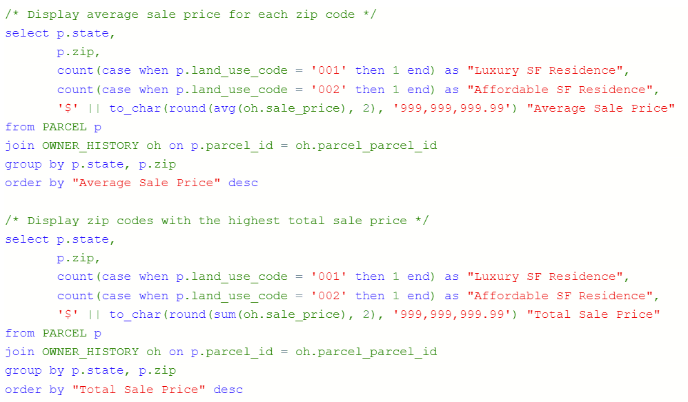 Query 1 showcases the average sale prices associated with different zip codes in descending order. Query 2 reveals the zip codes with the highest total sale prices in descending order.